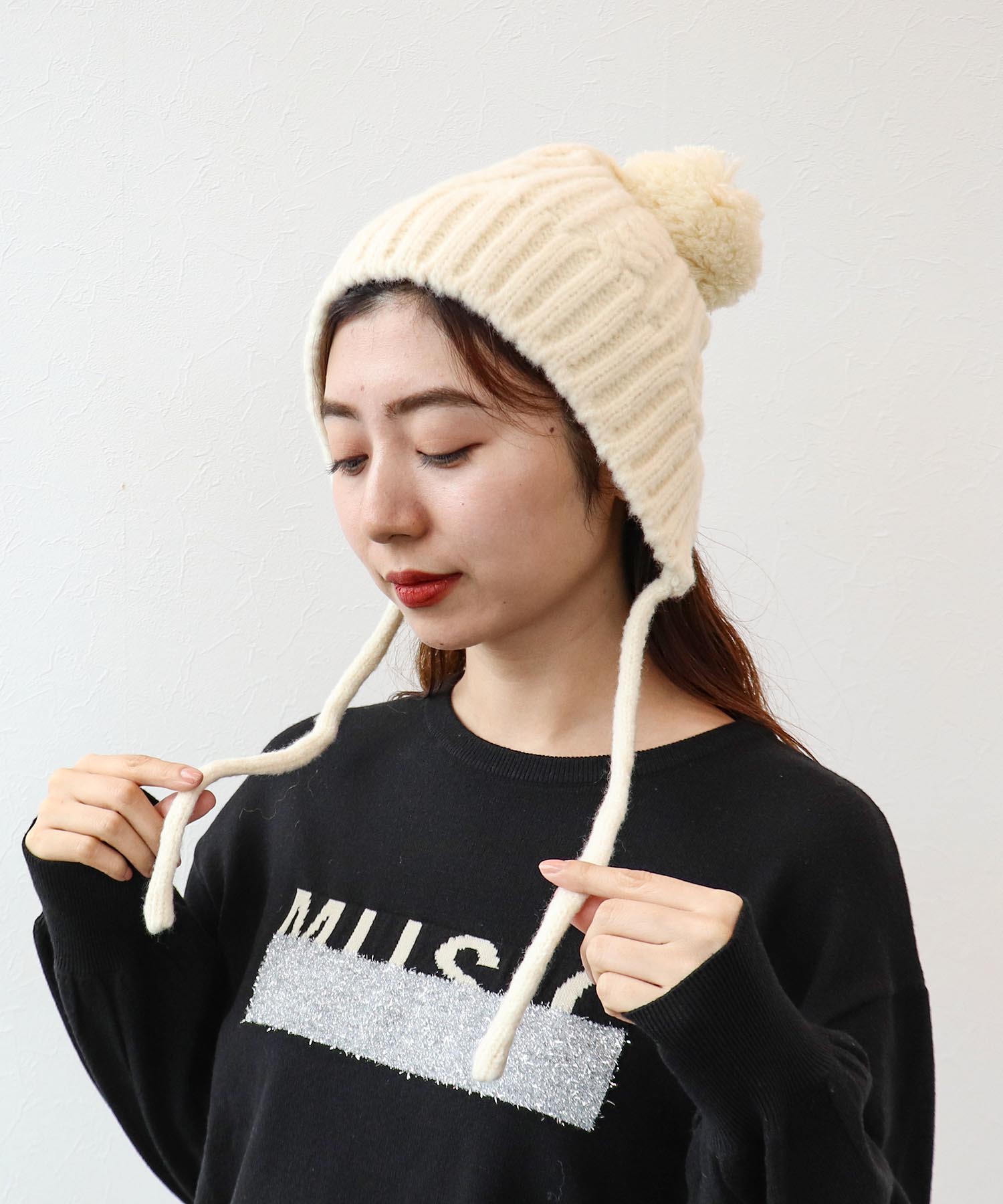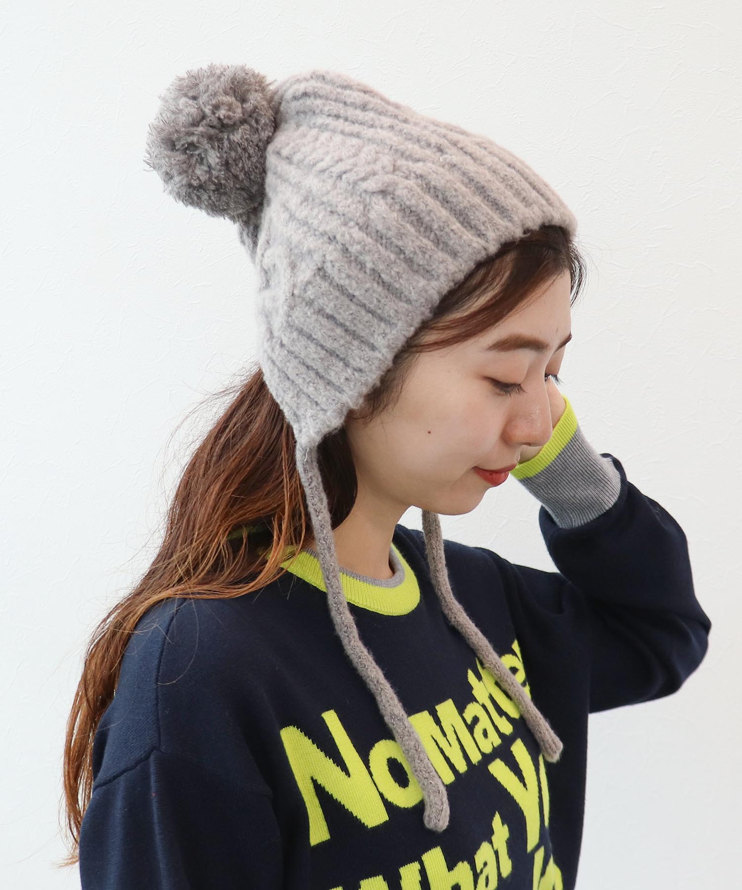 厚手のニットを着た際は、ローウエストで着ると◎