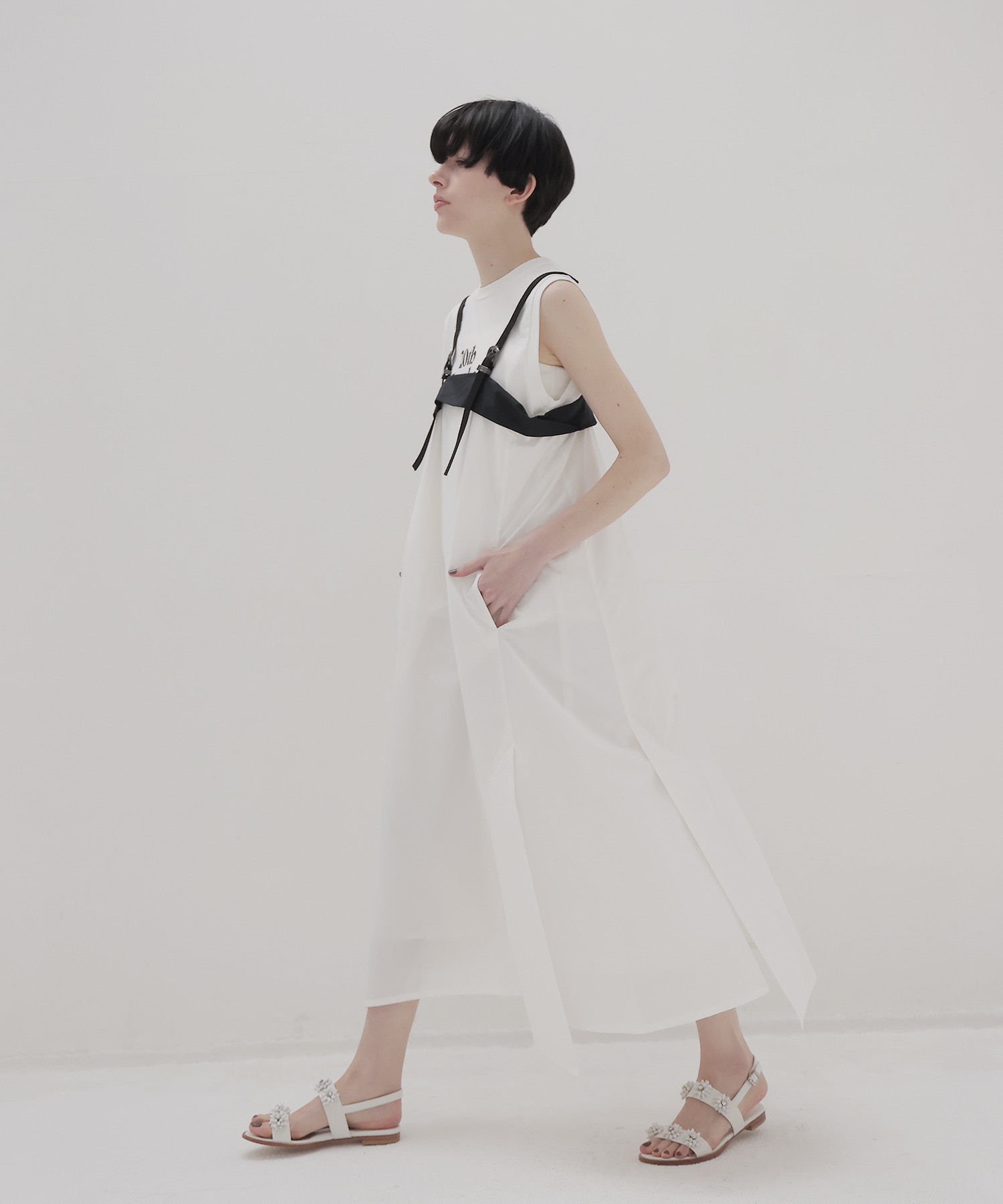 バックルベルトのパーツがアクセントのタフタ素材のワンピース。