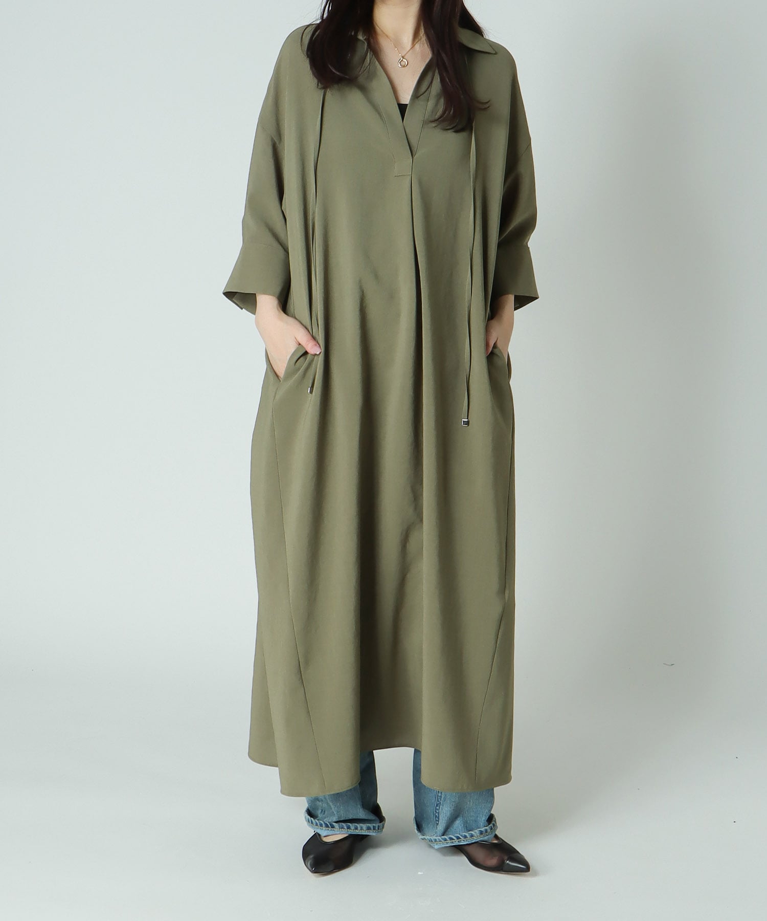 Horiuchi 167cm DRESSLAVE DRESSLAVE神戸店 2026.03.25 167cm/骨格ストレート/イエベ■dress (khaki/38)リネンライクなドライな風合いで、軽やかな印象。リラックス感のあるシルエットが、抜けのある着こなしに導きます。一枚でさらっと着られ、デイリーにも取り入れやすいアイテム。■denim (blue/24)鮮やかなインテンスブルーが目を惹くカラー。ショートレングスで足元に軽さを出し、バランス良く仕上がります。スタイリングのアクセントになる一本。 掲載アイテム <B7>linen like relax dress ¥27,000 <HAIKURE>CANDY SHORT LENGTH INTENSE BLUE ¥44,000 <CHRISTIAN VILLA>gloss leather top handle bag ¥29,000 DRESSLAVE 神戸店パンツワンピースバッグ20代DRESSLAVEデニムパンツジーンズシャツワンピースチュニックトートバッグ無地イエベ