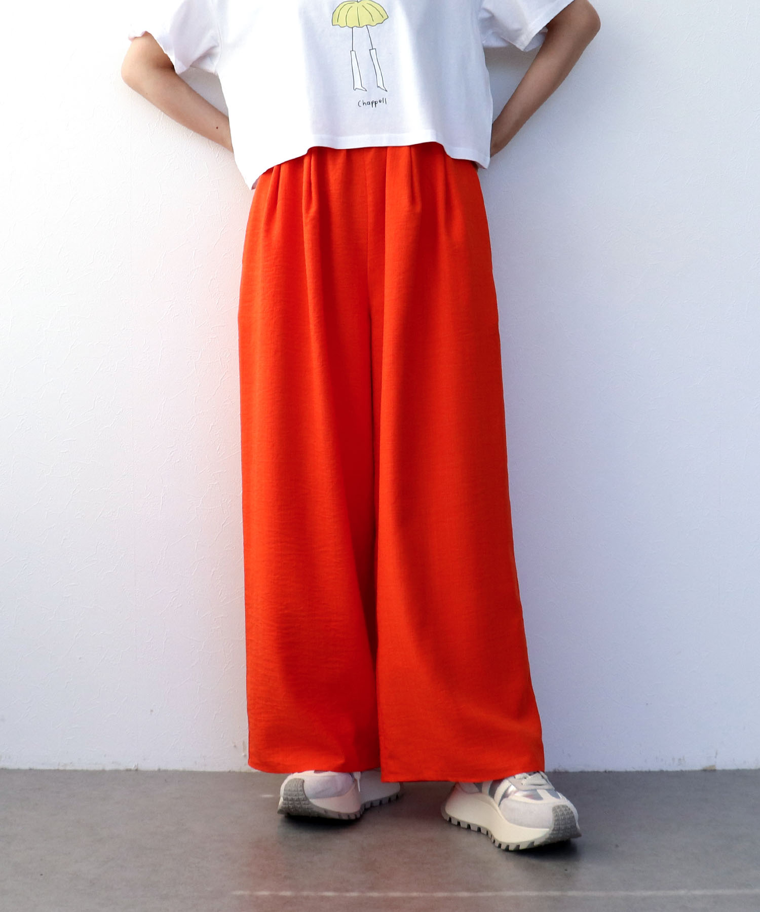 オレンジ~赤系のパンツは黒や濃い色で合わせるとシャープなコーデに。